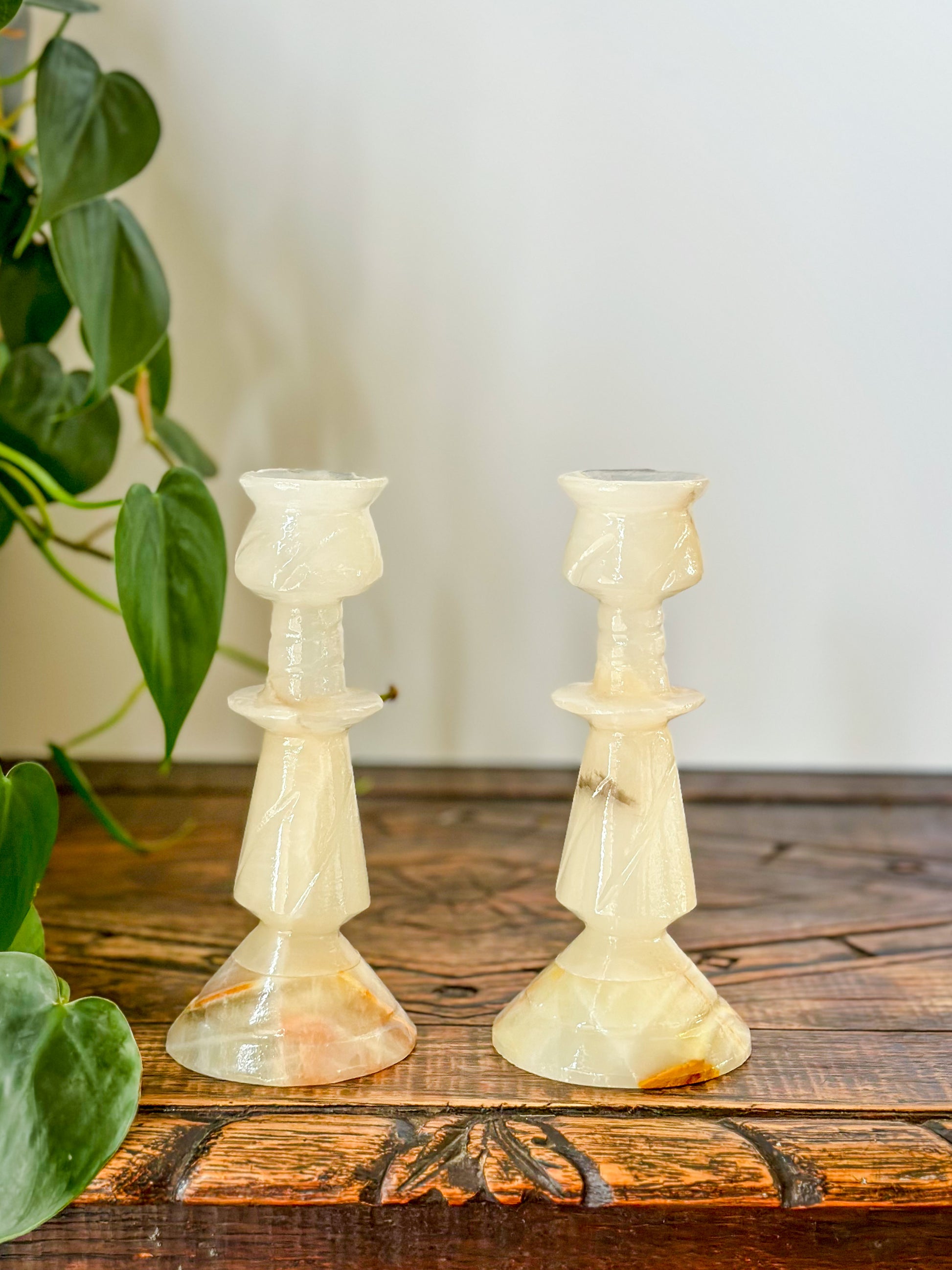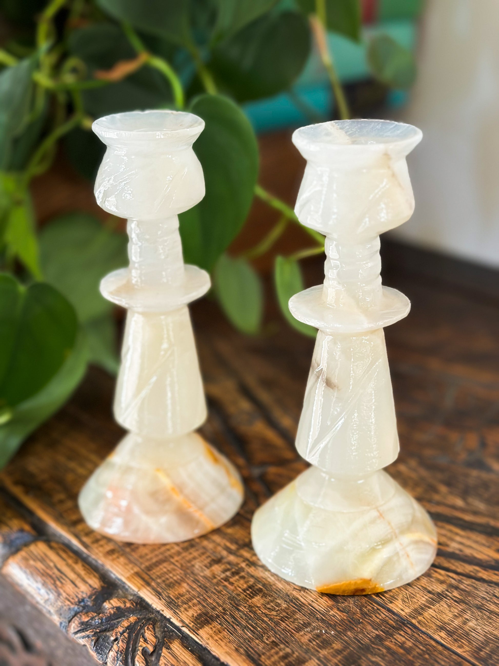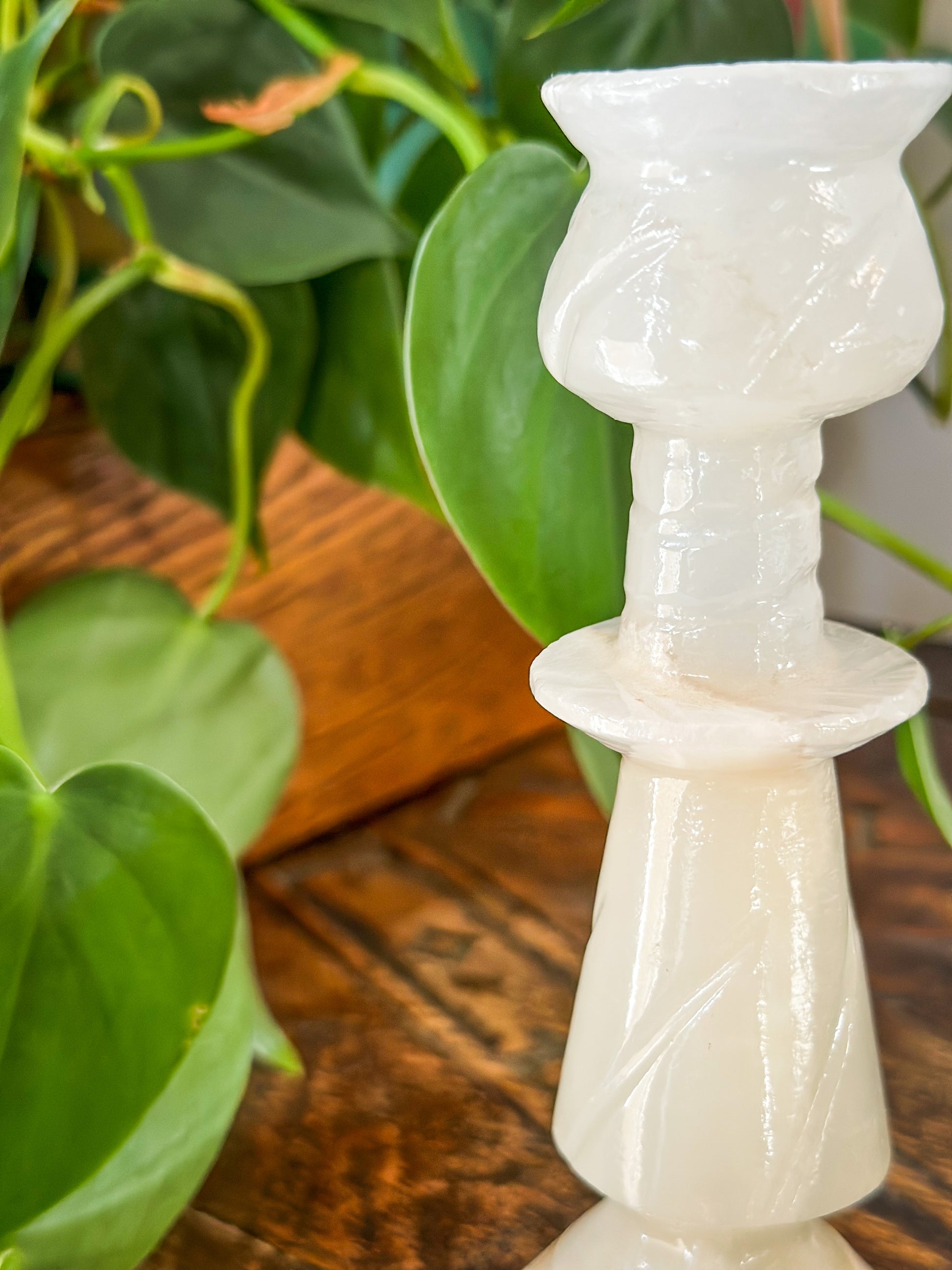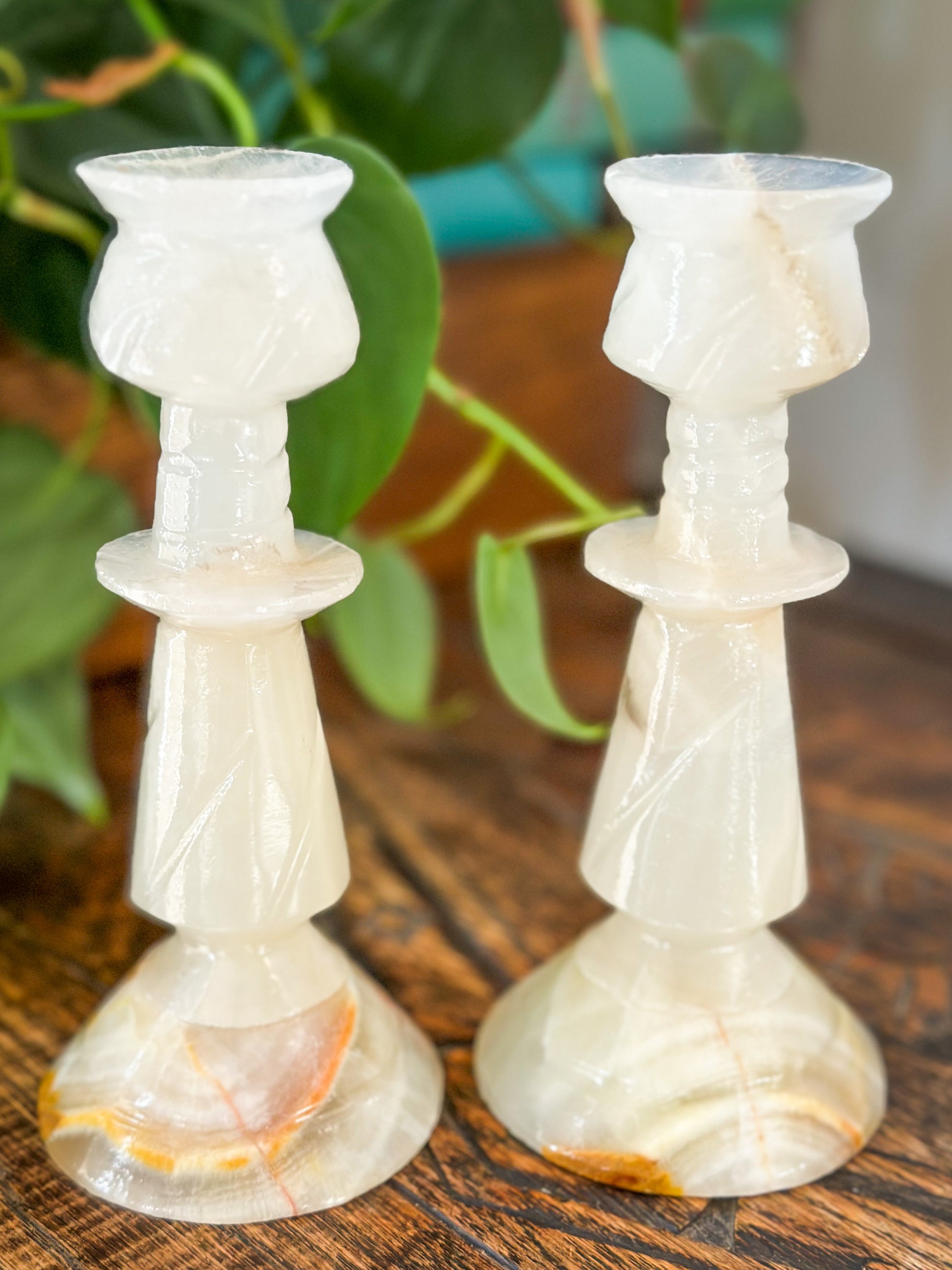 Alice is a pair of gorgeous vintage white onyx marble candle stick holders. She has beautiful orange veining and hand carved detailing.