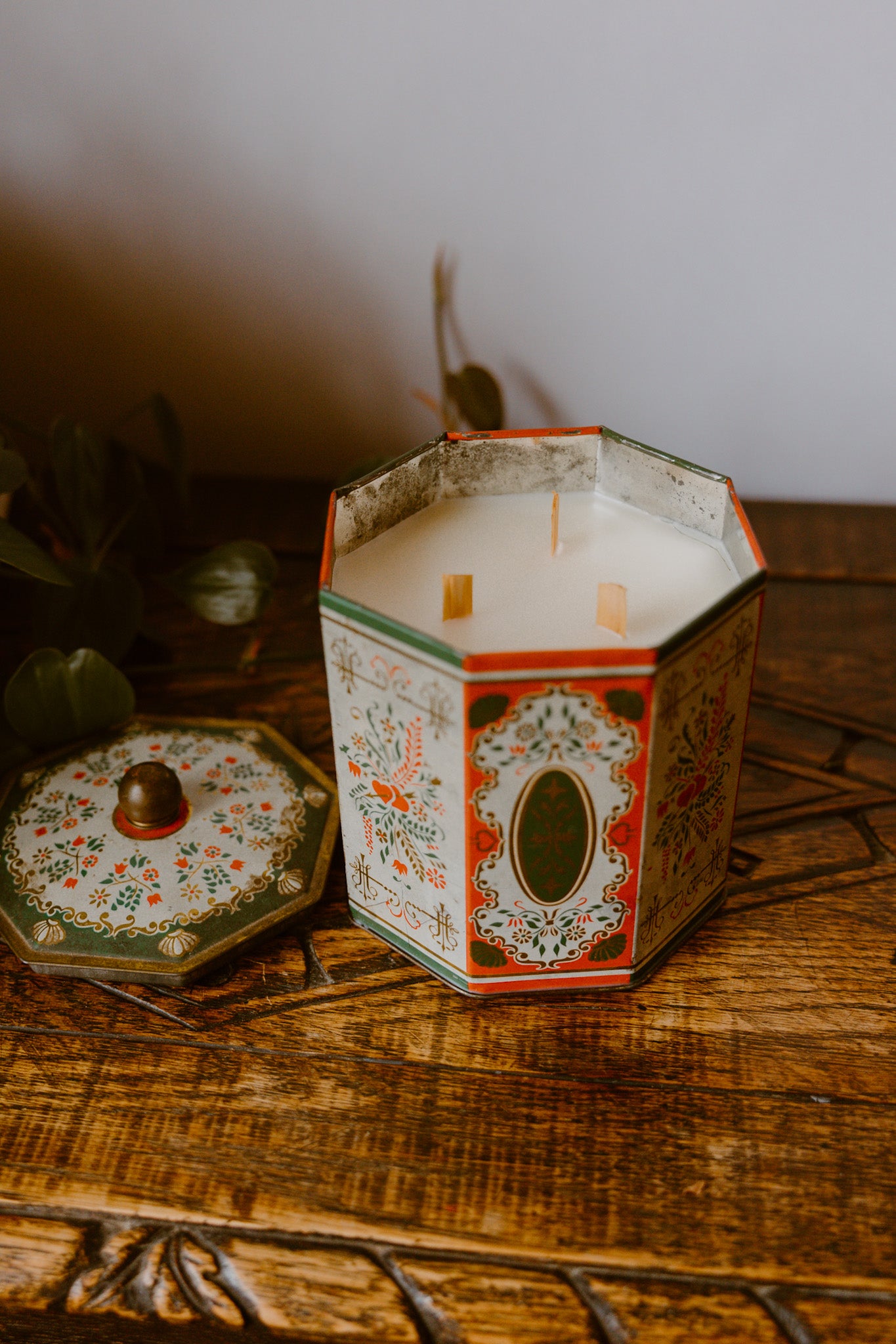 Step back in time with this charming nostalgic orchard hexagon candle. Poured into a beautifully decorated tin inspired by vintage European designs, this three-wick candle features a vibrant, intricate floral and fruit pattern in warm red and green hues, complete with a classic domed lid. It brings a touch of old-world charm and cozy nostalgia to any room. The unique hexagonal metal tin is reminiscent of classic biscuit or tea canisters from the mid-century. Three natural wicks ensure a generous, even melt pool and an inviting ambiance. Crafted with a clean-burning soy-based wax blend for a long-lasting and environmentally conscious experience. The decorative and durable tin is fully reusable, perfect for storing trinkets, tea, or other small items once the candle is finished.