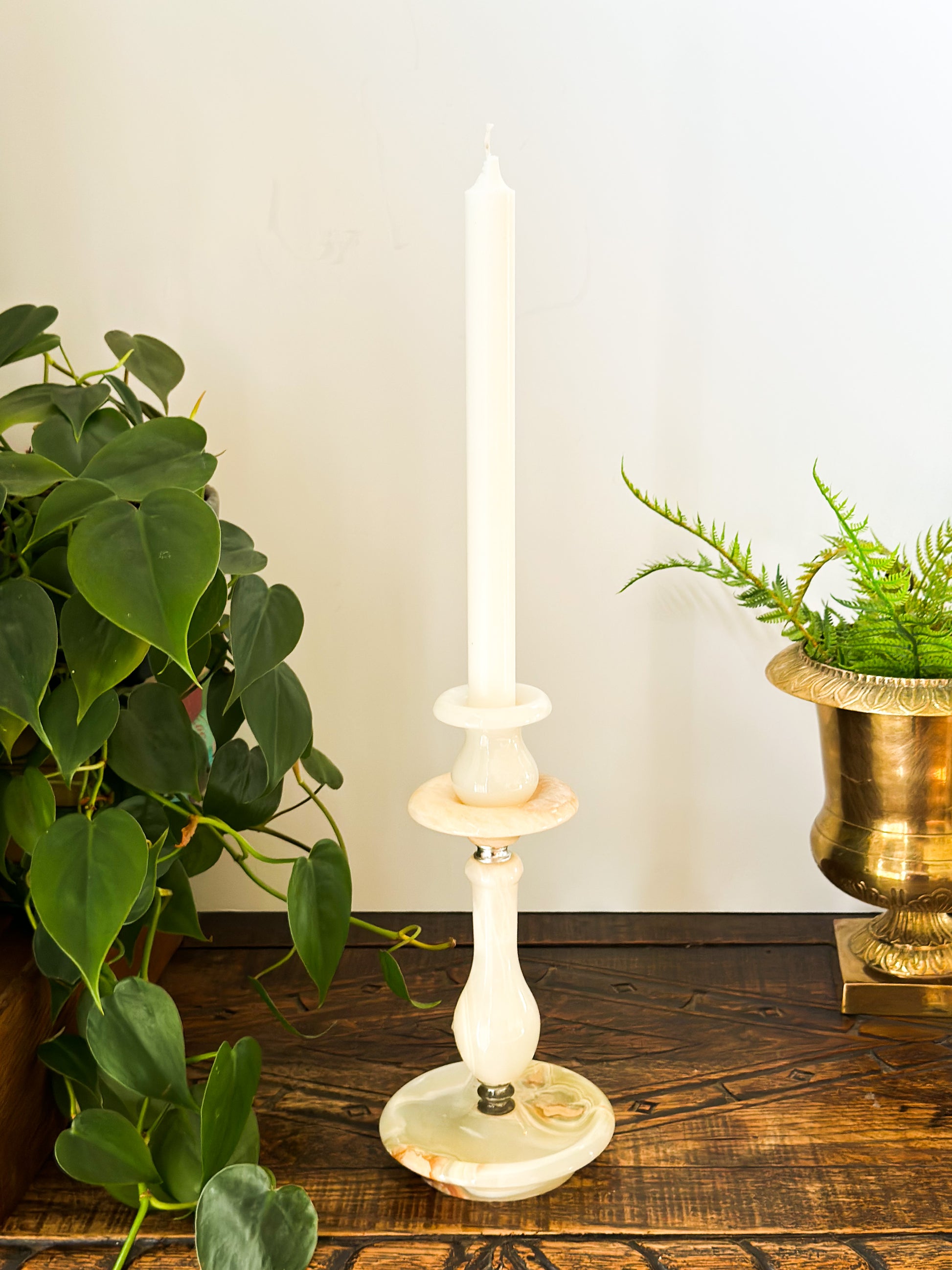 Single vintage white onyx marble candlestick holder with spike for securing candle.