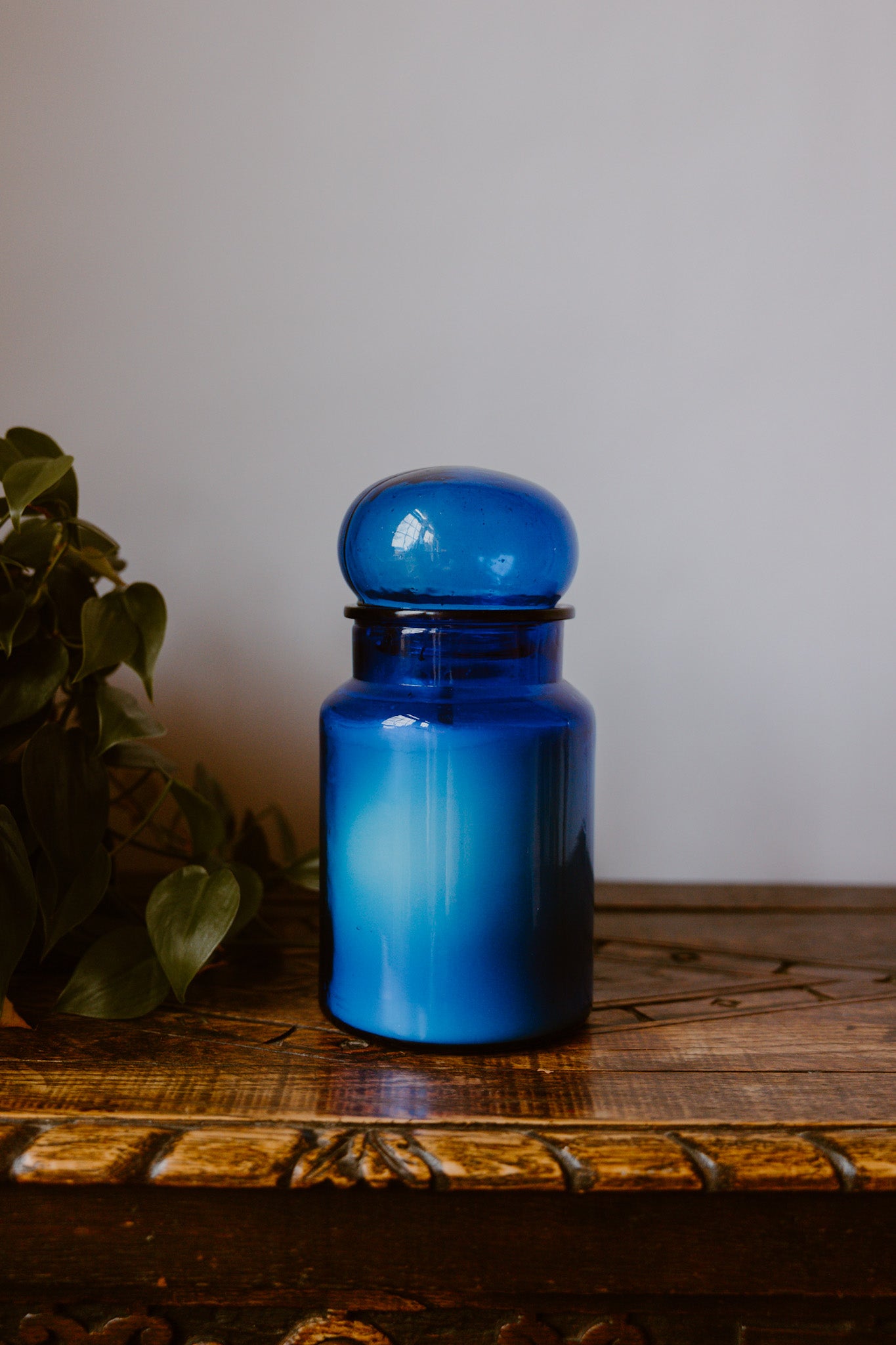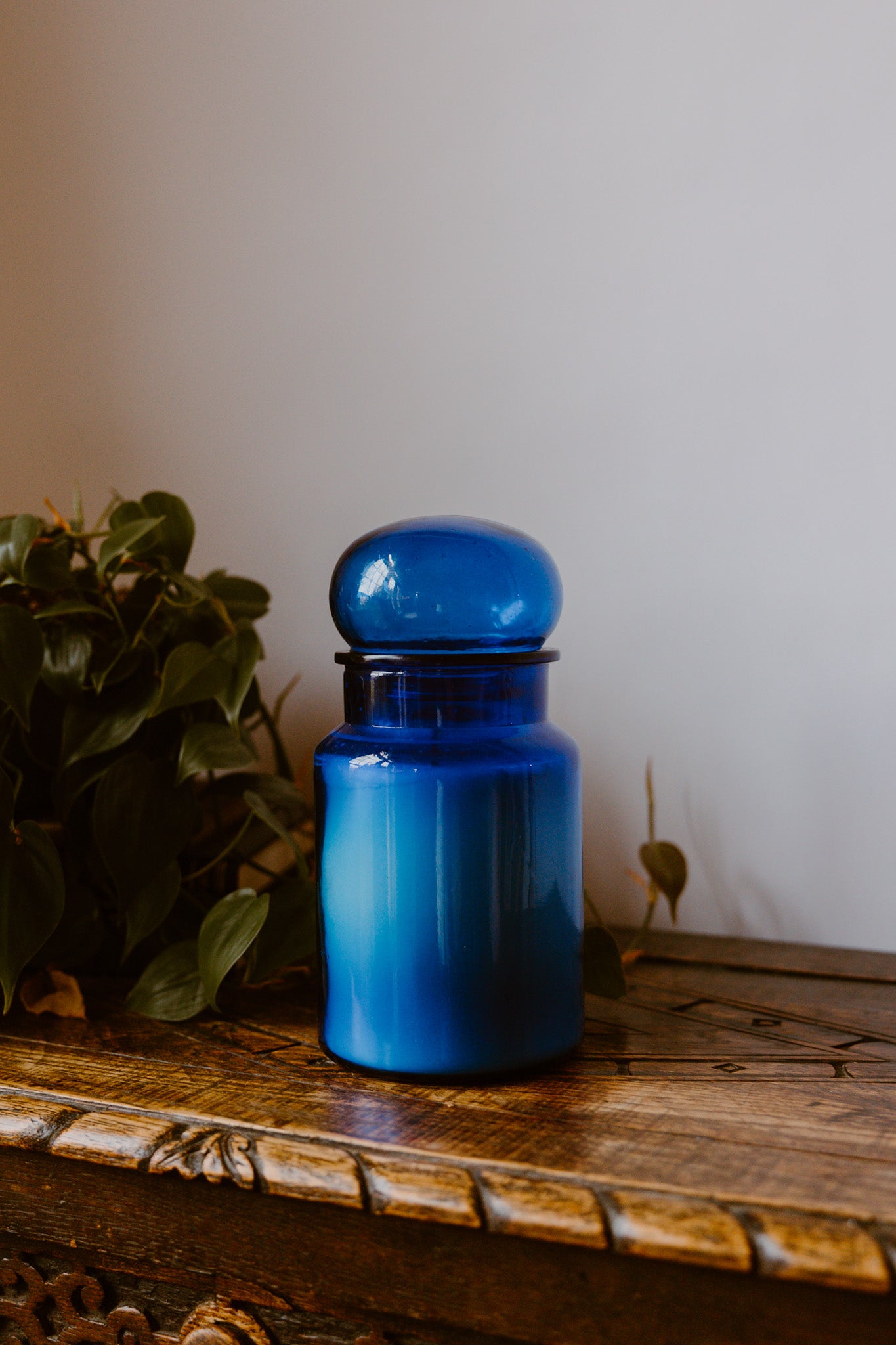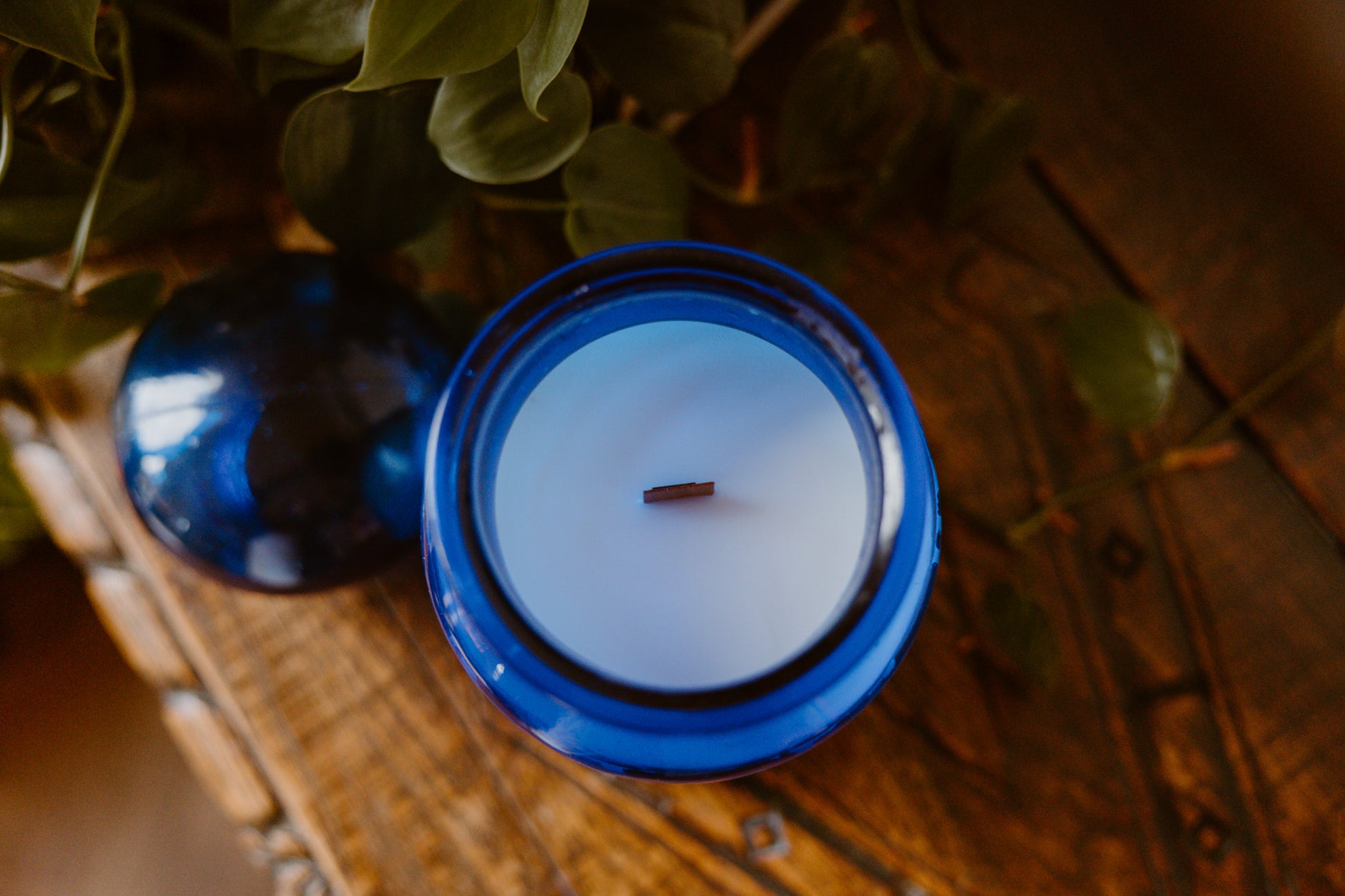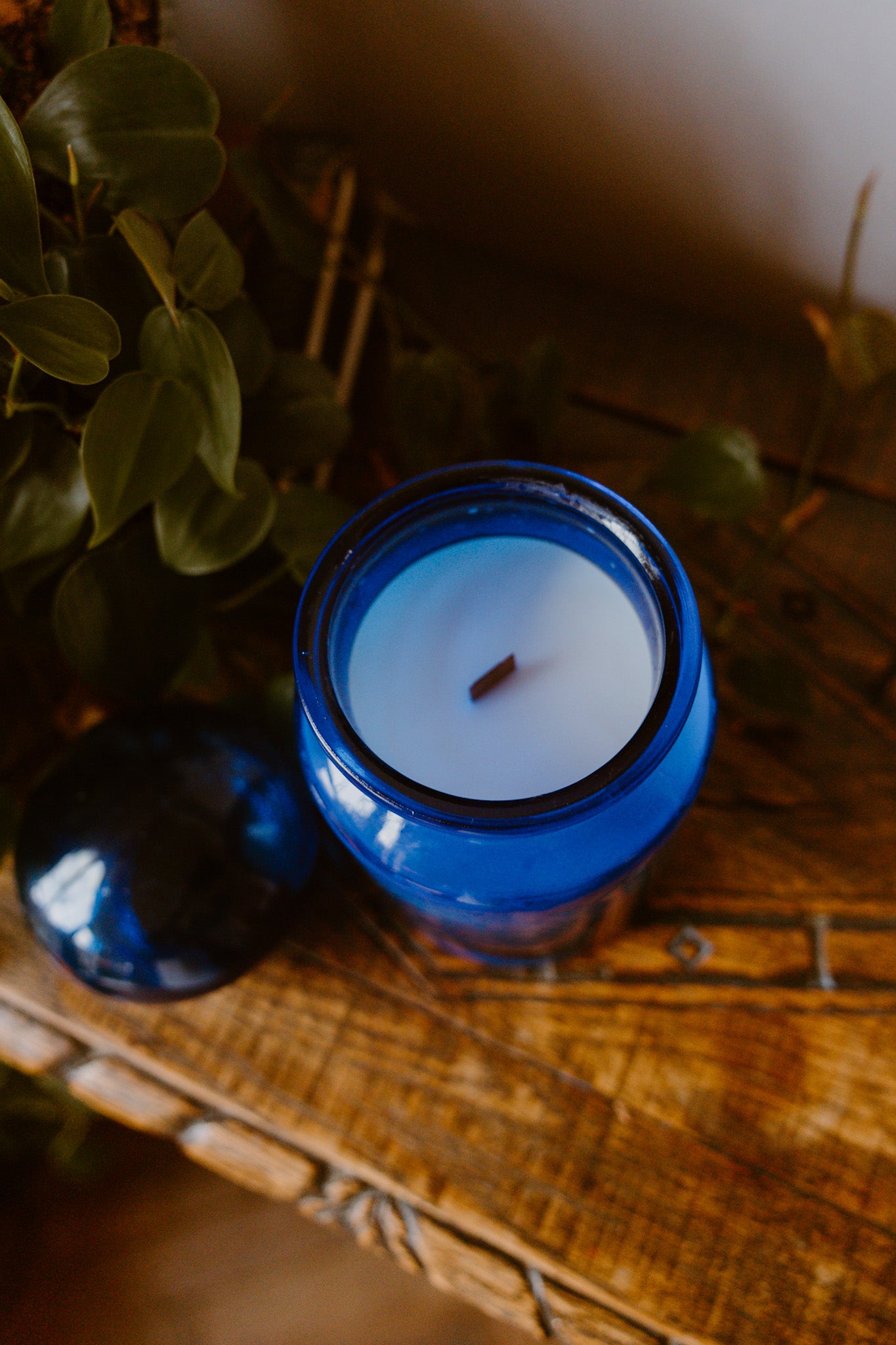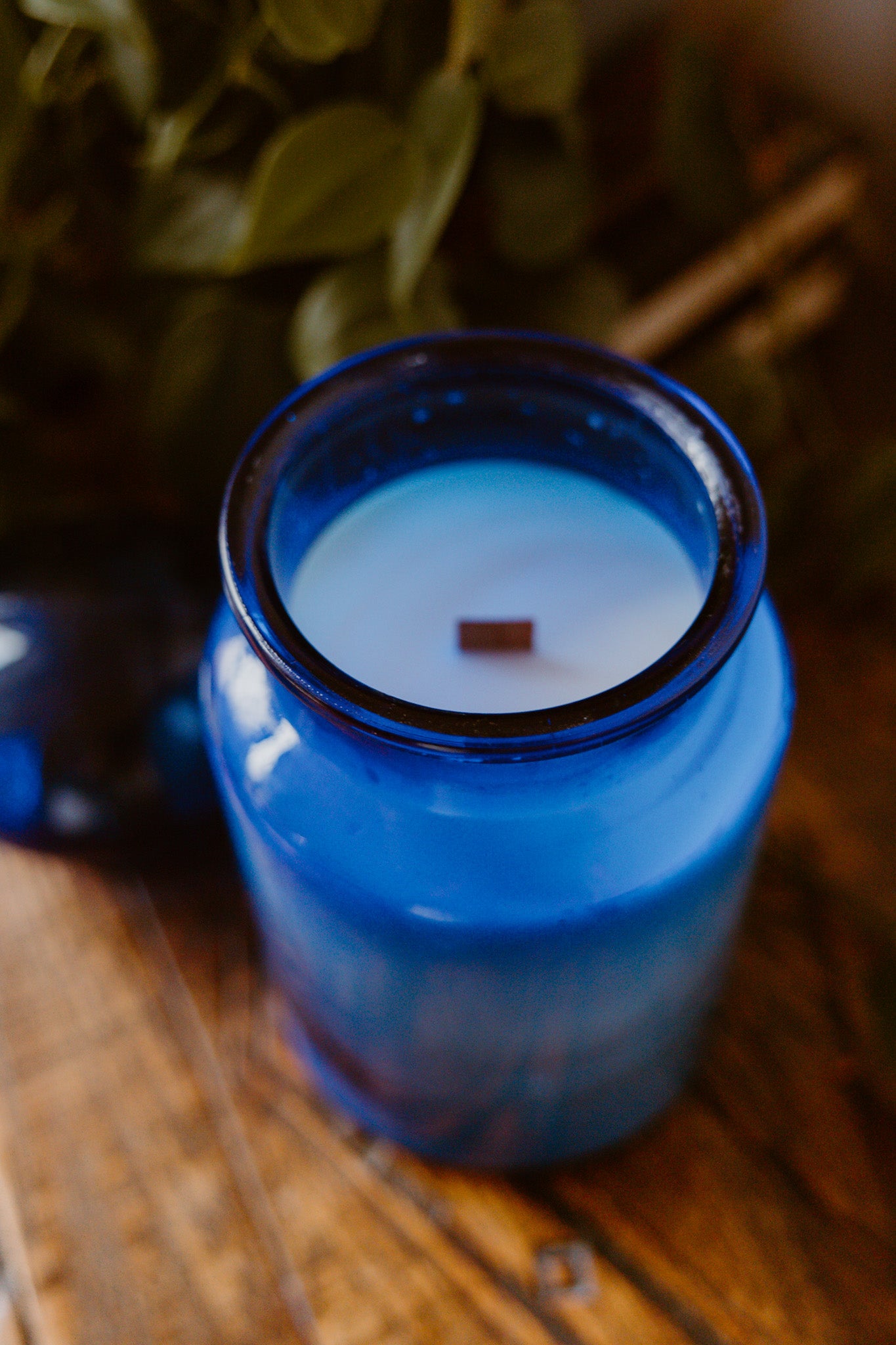 Immerse yourself in a wave of calm with our exquisite cobalt blue serenity jar candle. Housed within a striking, deep blue glass jar, this candle features a sleek, modern design that is perfect for adding a pop of vibrant color to any room. It is topped with a distinct wooden wick, which produces a unique, gentle crackling sound reminiscent of a cozy fireplace as it burns, enhancing the relaxing ambiance. Hand-poured with a premium, clean-burning soy-based wax blend, it promises an inviting fragrance experience and a clean burn that is better for your home environment. The durable and beautifully colored glass vessel is a stylish keepsake and can be beautifully repurposed as a storage container, small vase, or decorative item once the candle has finished its long burn time!