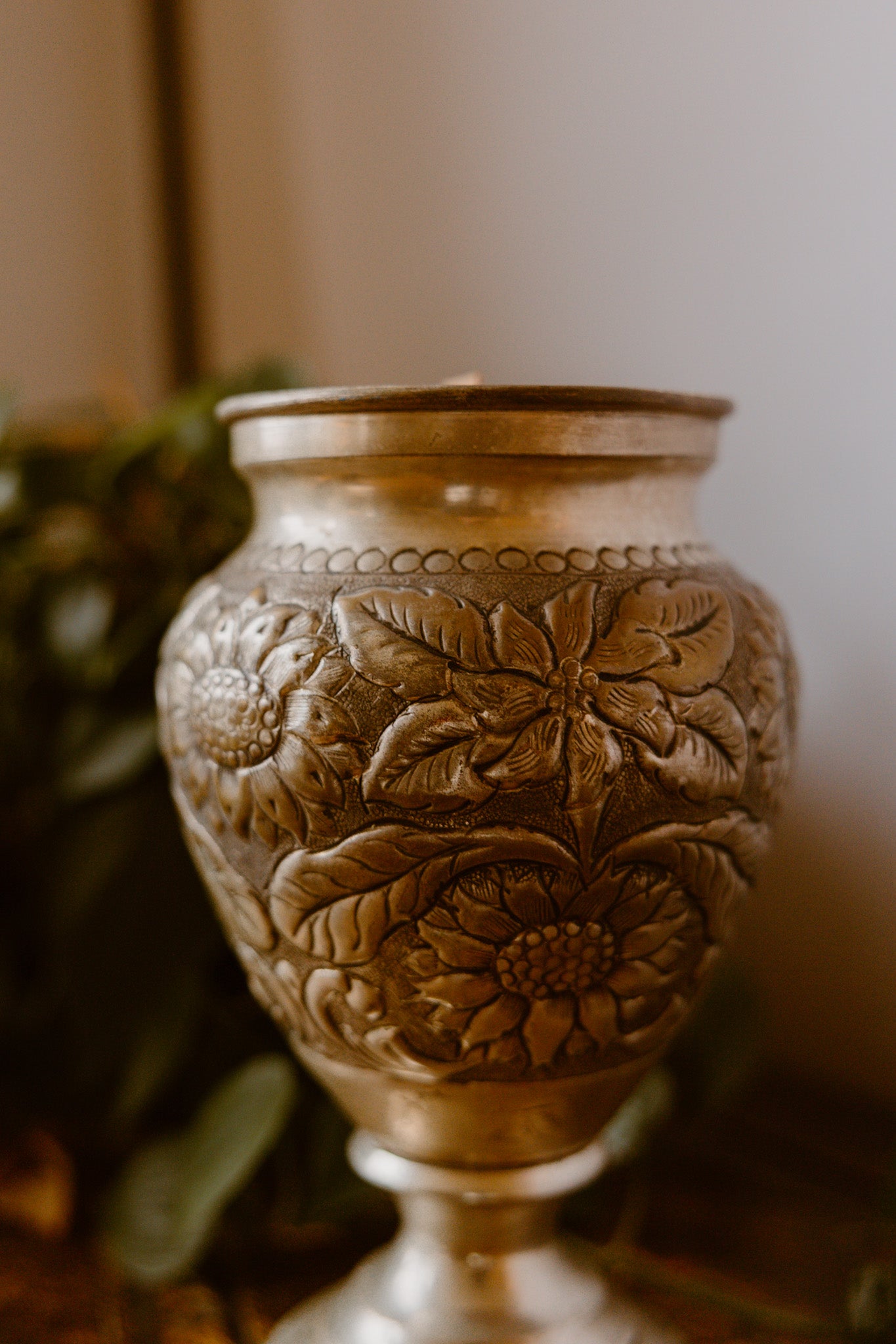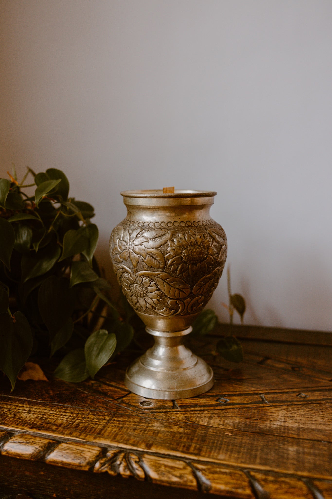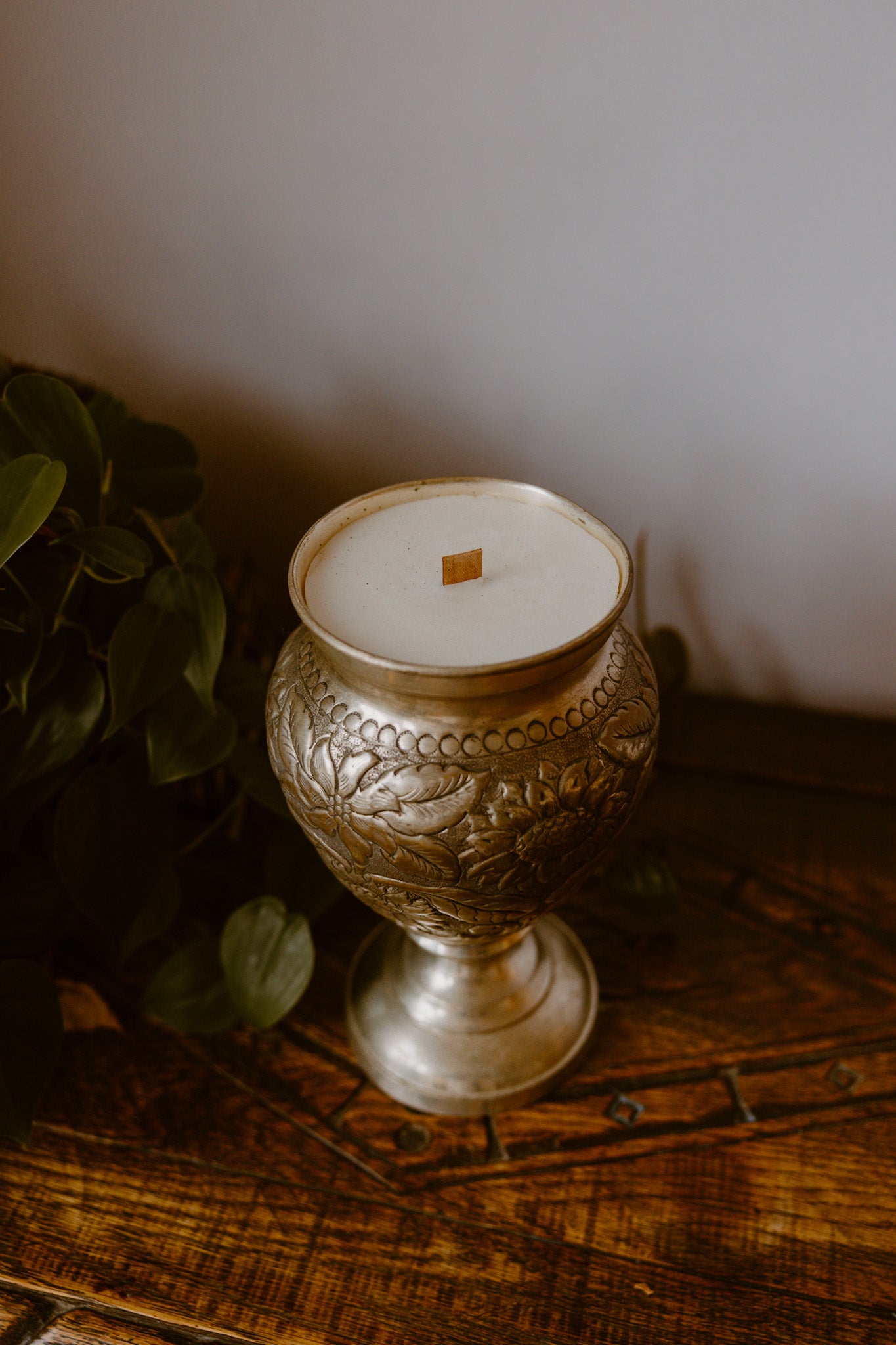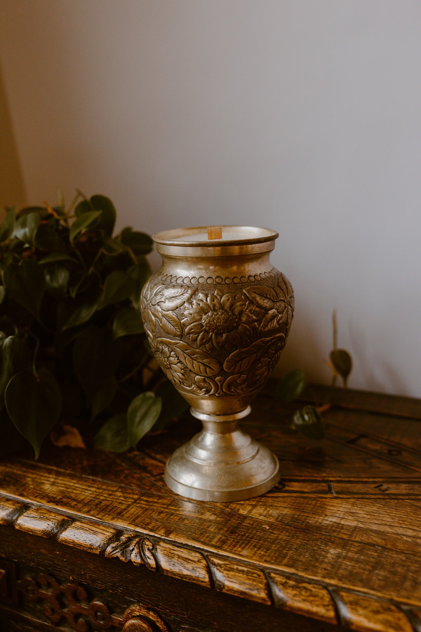 Infuse your home with a sense of historic elegance with this stunning antique silver urn candle. This unique piece is housed in a beautifully crafted metal urn or goblet-style vessel, featuring intricate, hand-embossed leaf and vine patterns and a rich, aged silver-toned finish that adds depth and character to any decor style. Hand-poured with a premium, clean-burning soy-based wax blend, it promises an inviting ambiance and a single, crackling wooden wick for a cozy, rustic atmosphere. The durable and timeless vessel is a true keepsake and can be beautifully repurposed as a decorative vase, planter, or unique storage pot once the candle has finished its burn.