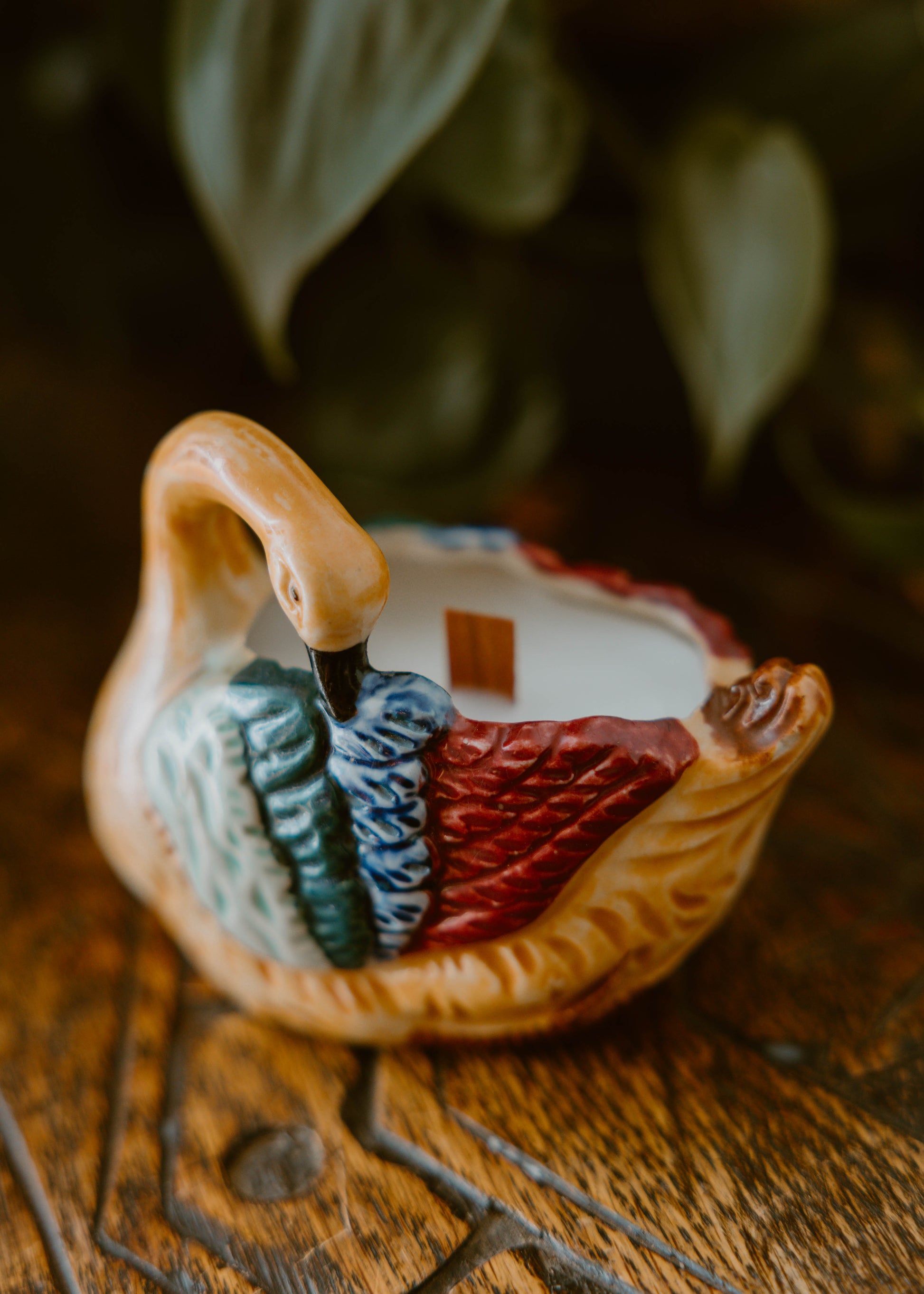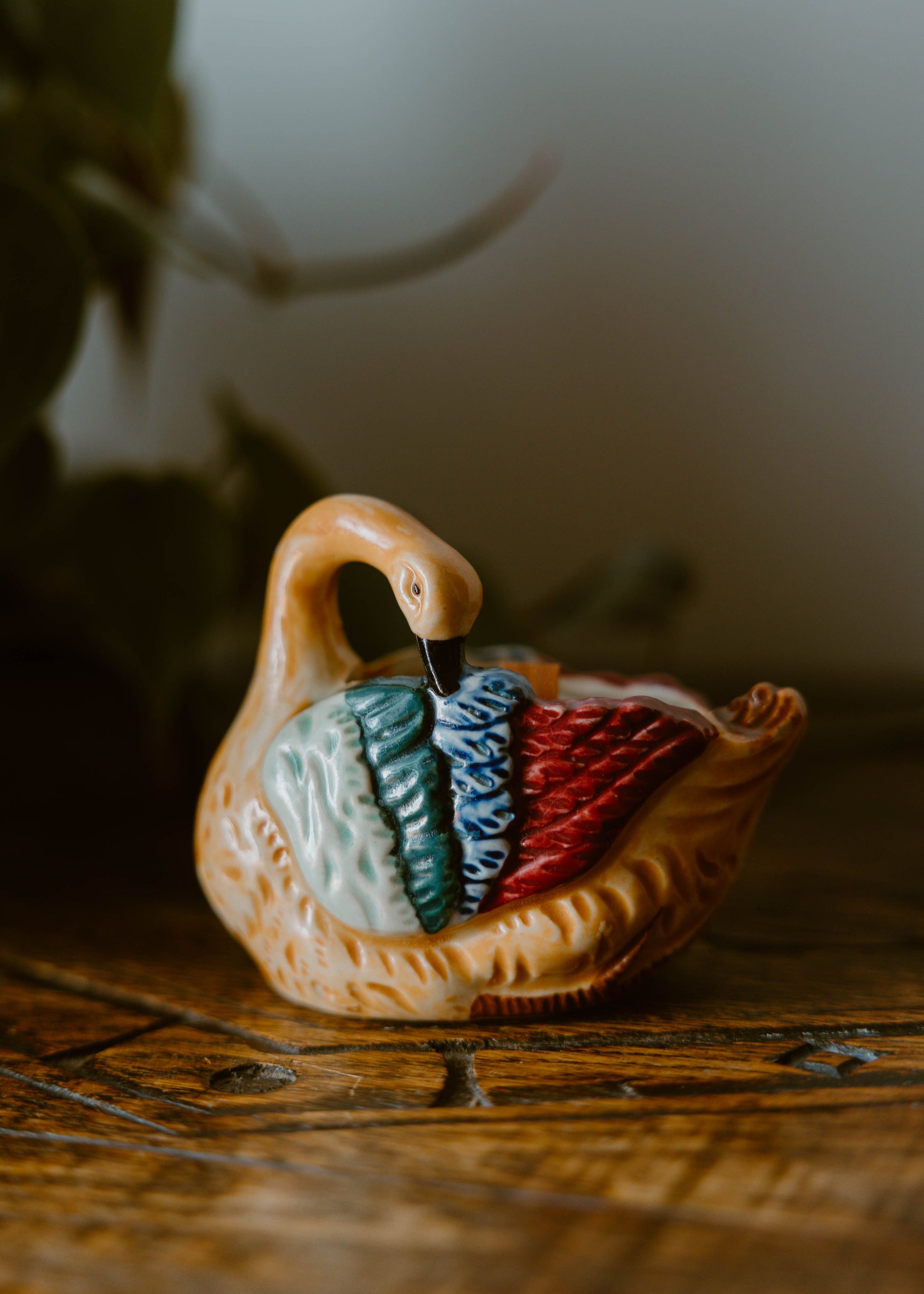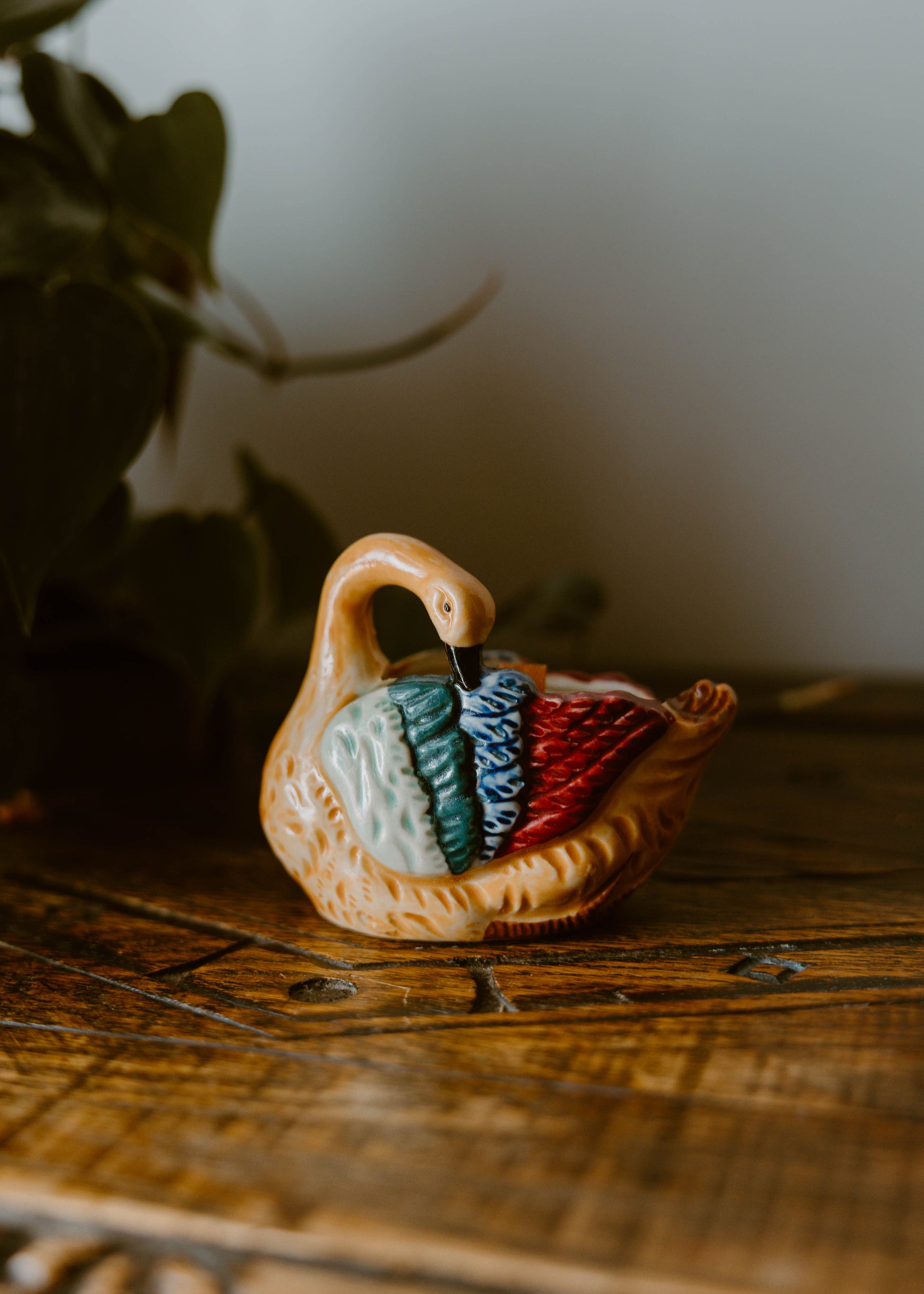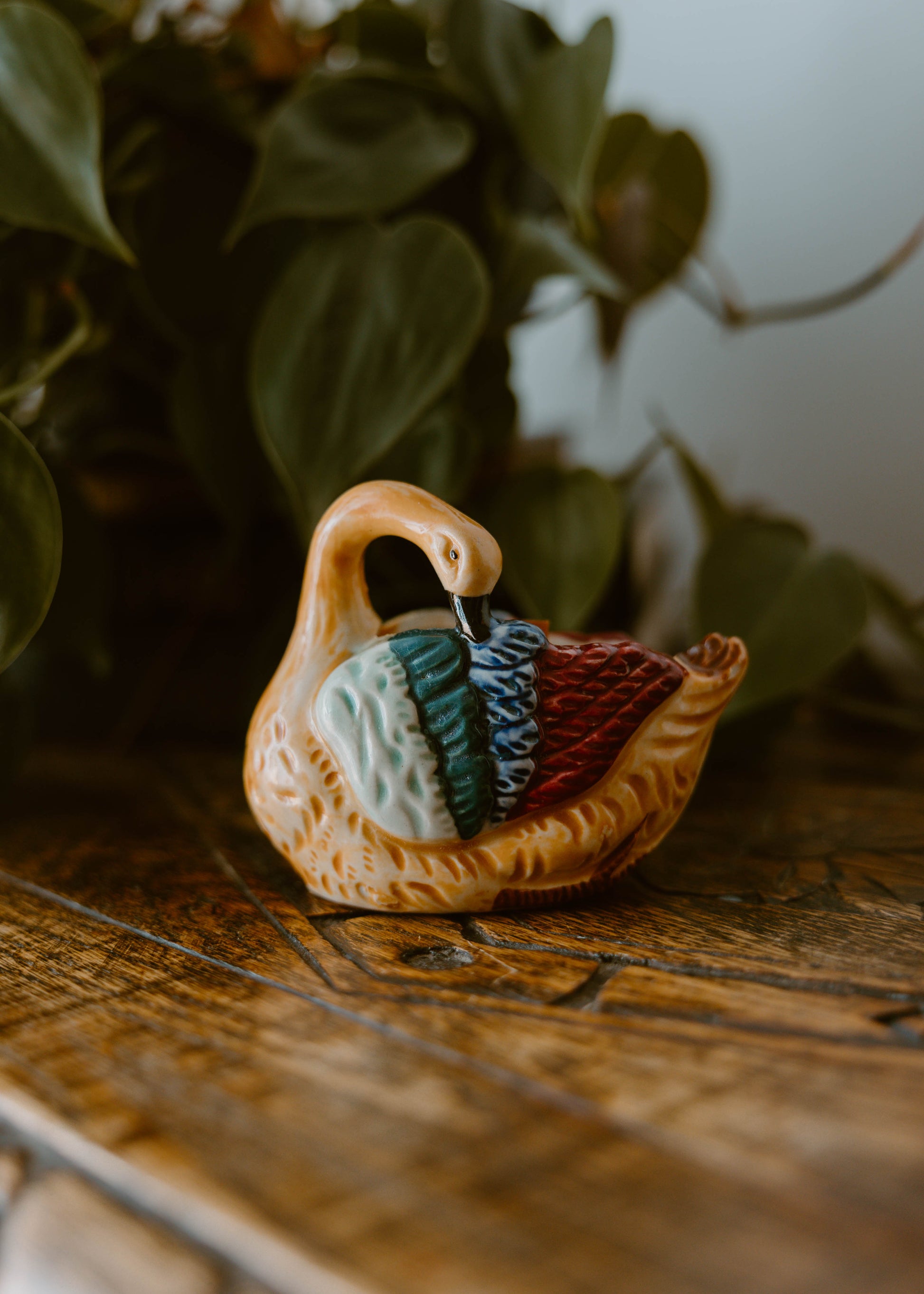 Crafted from high-quality ceramic material, this stunning vintage piece is a mid-20th-century Swan planter likely made by Napco. The swan's graceful design and glazed finish will surely catch the eye of any collector or animal lover. Its small size is perfect for displaying on a shelf or a desk next to a plant.