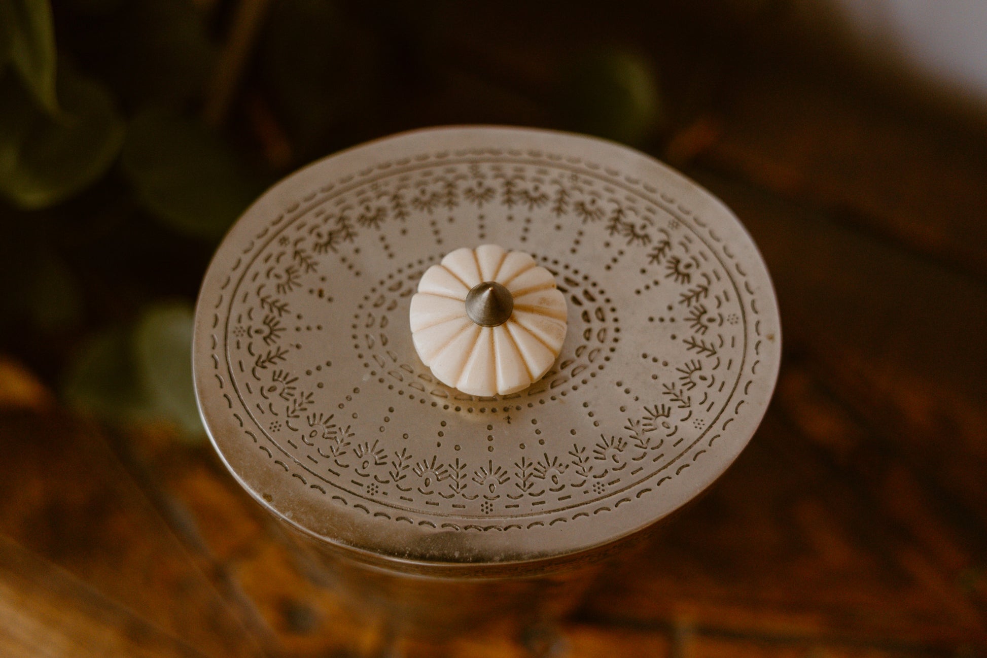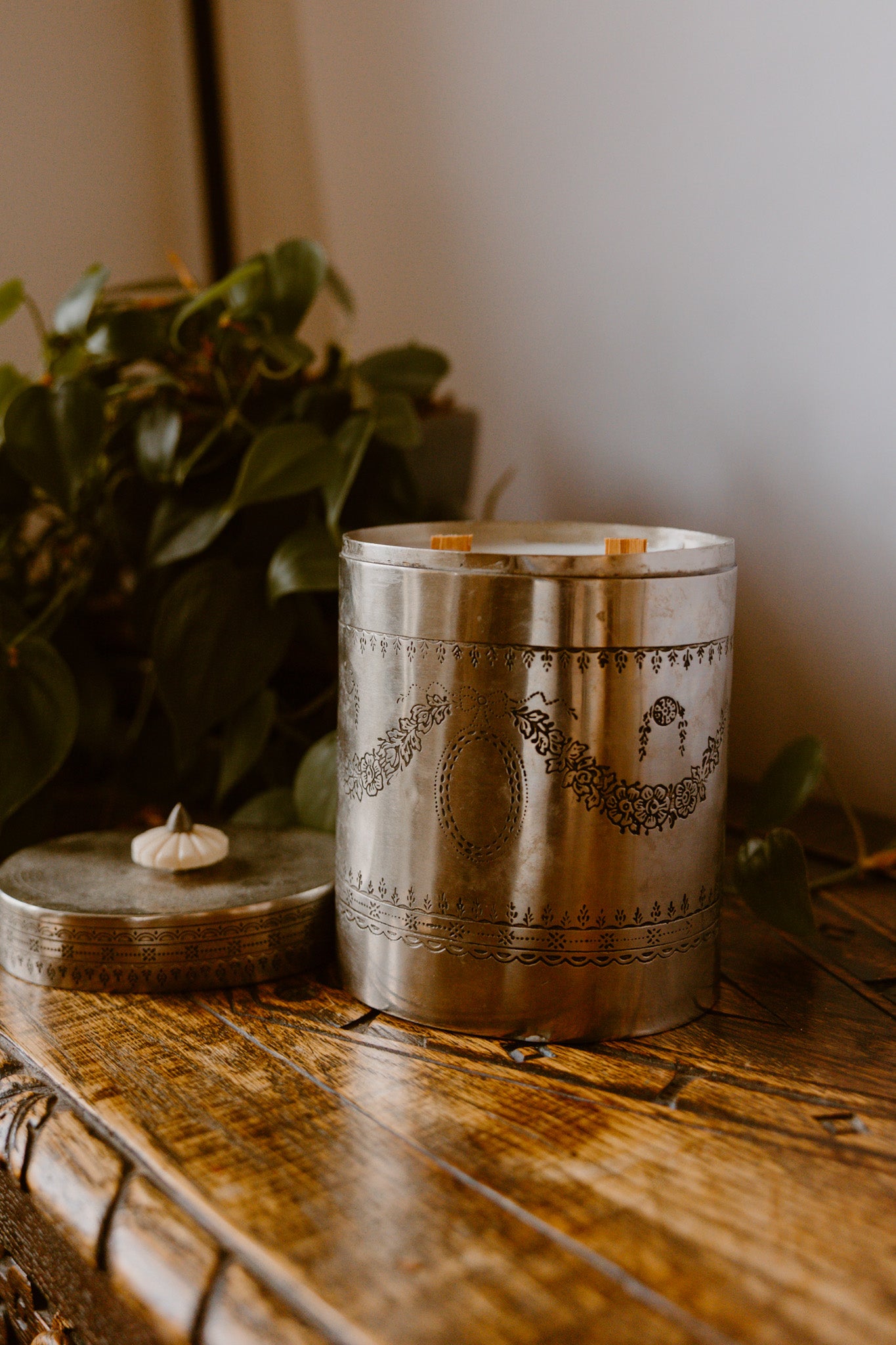 Elevate your home decor with the exquisite mandala etched iron pot candle. This oversized, two-wick candle is housed in a unique vessel crafted from antiqued, sealed, galvanized iron and etched with intricate mandala-inspired patterns. The design is reminiscent of delicate henna motifs, adding a touch of global elegance and rustic charm to any setting. Each iron pot is acid-etched and finished by hand, ensuring a unique and high-quality product. The dual-wick design provides a clean and even burn with minimal soot, ensuring optimal fragrance diffusion. Made with a natural soy wax blend and high-quality essential and fragrance oils for a long-lasting and environmentally conscious burn. The beautiful and durable metal vessel is designed to be cherished and repurposed long after the burn time is complete!